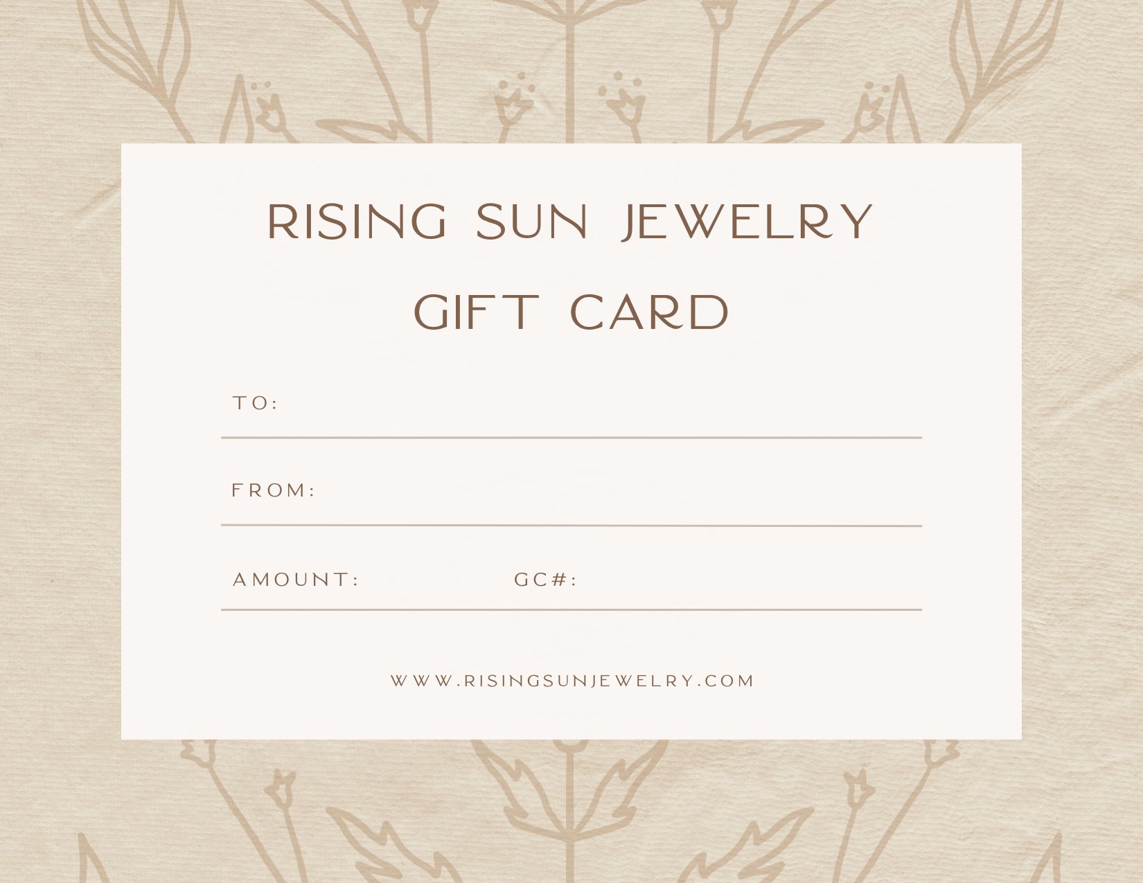 Purchase a digital Rising Sun Jewelry gift card for your loved ones, which will be delivered via email and never expires. The gift card number will be sent to the email provided at checkout. If desired, a printable graphic can be requested by emailing info@risingsunjewelry.com.